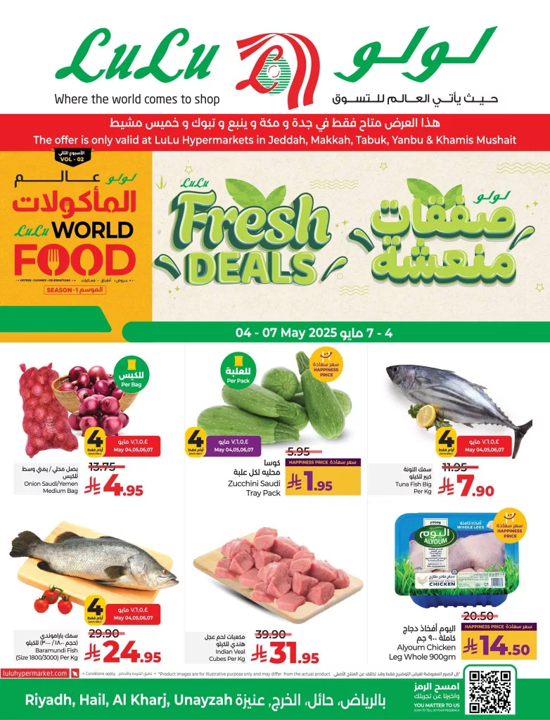 عروض لولو الرياض الطازج تشمل تخفيضات كبيرة على اللحوم والدواجن بأنواعها سواء كانت محلية أو مستوردة مع تنوع كبير بين صدور الدجاج وقطع الدجاج المختلطة واللحوم الحمراء مثل لحم البقر والضأن بالإضافة إلى عروض مميزة على الخضار والفواكه الموسمية مثل العنب والتفاح والكوسا والبطاطا