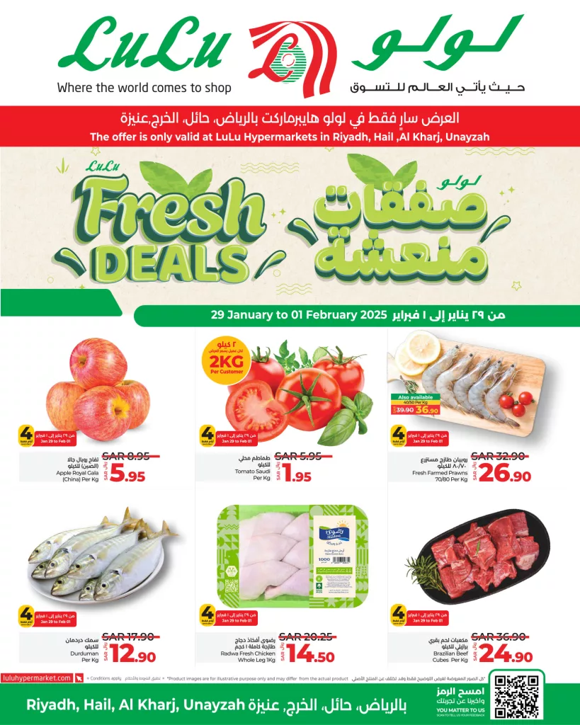 إذا كنت تبحث عن اللحوم الطازجة والأسماك بأفضل الأسعار فإن لولو الرياض توفر لك مجموعة واسعة من الخيارات المثالية من سمك الهامور و الروبيان المقشر والسالمون المدخن إلى لحم البقر البرازيلي و لحم الغنم التنزاني ولحم العجل الهندي كلها متاحة بأسعار مغرية