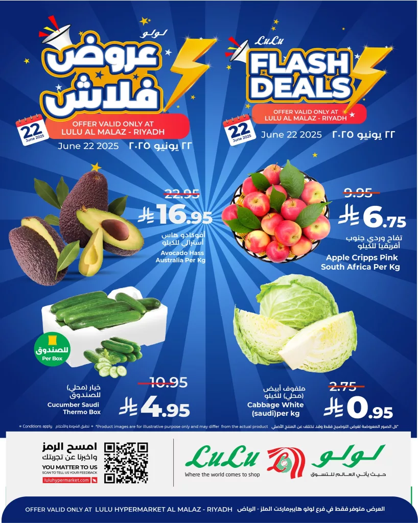 عروض لولو الرياض الاحد 22 يونيو 2025 تقدم مجموعة مختارة من أجود أنواع الخضار والفواكه الطازجة المستوردة والمحلية حيث تشمل التخفيضات أفوكادو هاس الأسترالي المعروف بجودته العالية وتفاح كريبس الوردي من جنوب أفريقيا الذي يتميز بمذاقه المنعش ولونه الجذاب كما تتوفر كميات محدودة