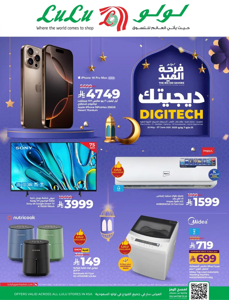 عروض لولو السعودية الاسبوعية الأحد 25 مايو 2025 تقدم لك تشكيلة مذهلة من الإلكترونيات وأجهزة المنزل الذكية بأسعار تنافسية تشمل الهواتف الذكية الحديثة مثل آيفون 16 برو ماكس وأحدث إصدارات أوبو وHMD إضافة إلى تلفزيونات سوني الذكية ومكيفات إمبيكس الفعالة مع غسالات ومواقد