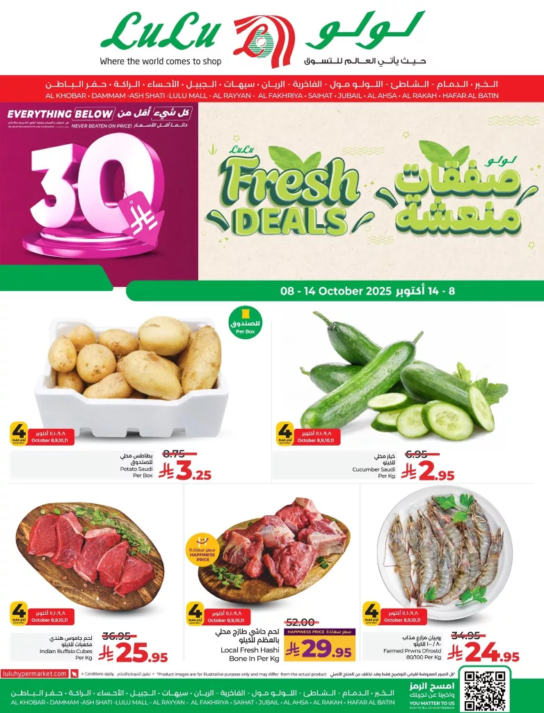 عروض لولو المنطقة الشرقية الأربعاء 8 أكتوبر 2025 تقدم مجموعة متنوعة من المنتجات الطازجة مثل لحم العجل الهندي الطازج بدون عظم ولحم عجل باكستاني بالعظم وكبدة بقري نيوزيلندي بالإضافة إلى لحم ضأن نيوزيلندي طازج وكبدة ضأن طازجة ودجاج طازج ومجمد بأنواعه المختلفة كما تتوفر البطاطس السعودية والخيار الطازج