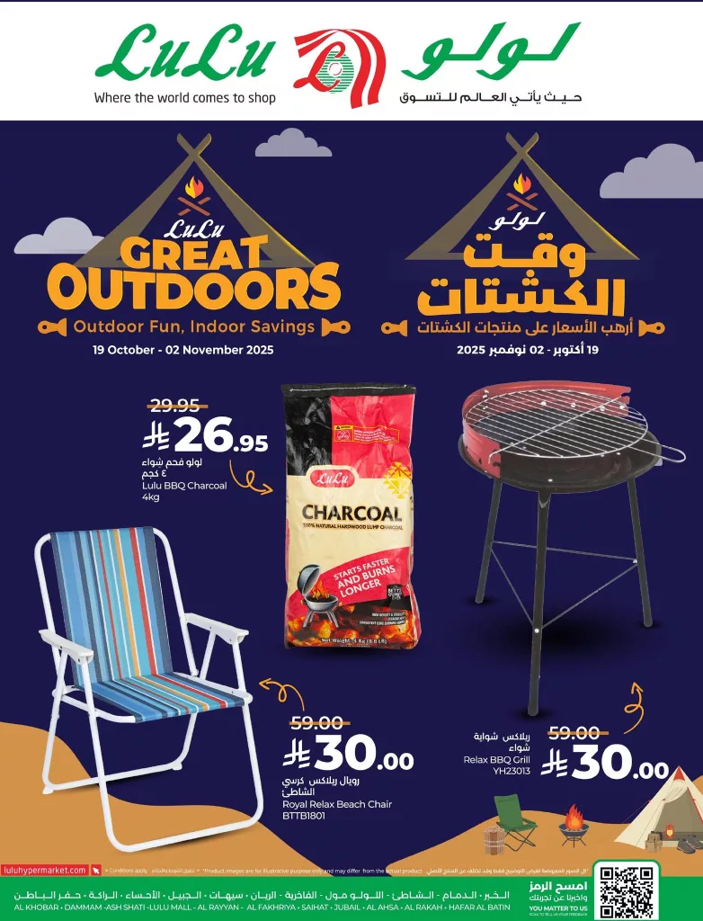 عروض لولو المنطقة الشرقية الأحد 27 ربيع الثاني 1447هـ تقدم تشكيلة واسعة من مستلزمات التخييم والرحلات بالإضافة إلى مقاعد وطاولات رحلات كما تشمل مظلات حدائق قوية وهياكل قابلة للطي و بتوفر ايضا مستلزمات الشواء الحديثة مثل الشوايات المتنوعة وأدوات الطهي المصاحبة بالإضافة إلى كراسي البحر وأكياس الفحم