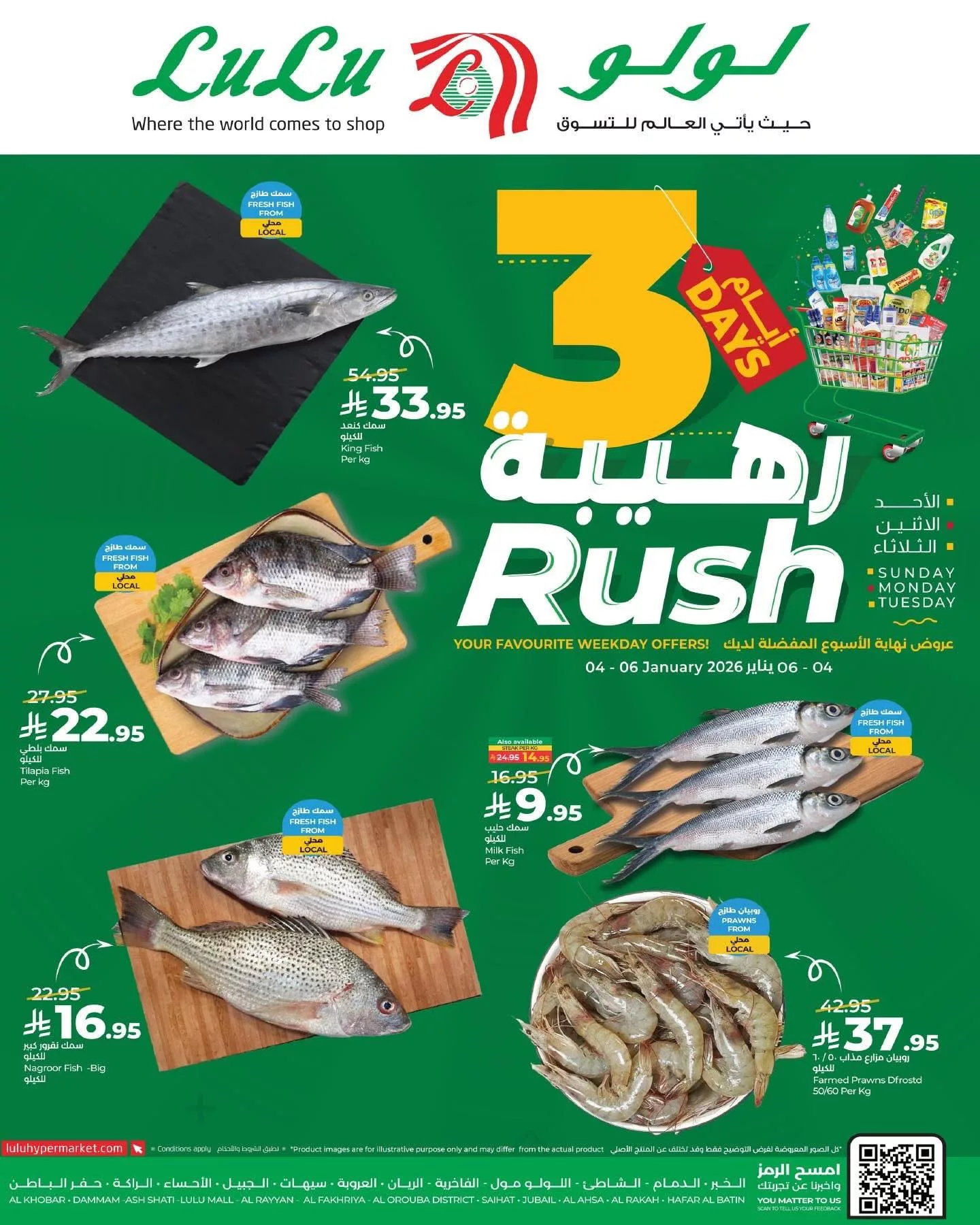 عروض لولو المنطقة الشرقية لاحد 4 يناير 2026 – 15 رجب 1447هـ تحتوي علي منتجات العناية الشخصية والمنظفات مثل اللوشن والعطور والكريمات والمعاجين والأكياس والمنظفات مع فواكه طازجة كالتفاح والفراولة والمانجو والمشمش والبرتقال والموز والسردين والأسماك و تشمل اللحوم الطازجة مثل لحم البقر والغنمي والسمك والروبيان
