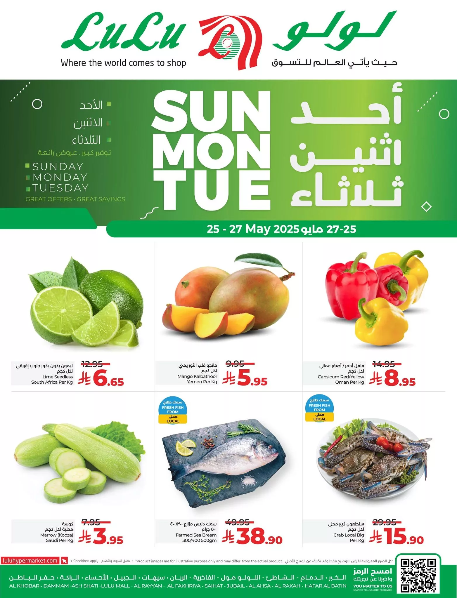 عروض لولو المنطقة الشرقية اليوم تشمل أيضا خضروات طازجة وأسماك محلية ومستوردة مثل الكوسة والفلفل والمانجو والليمون إلى جانب الكابوريا والسيبريم والتونة والبراكودا والتي تعتبر من أهم المكونات للمائدة الصحية حيث يتم تقديمها بجودة ممتازة وضمن تخفيضات حقيقية تتيح للمتسوقين التوفير والاختيار الذكي