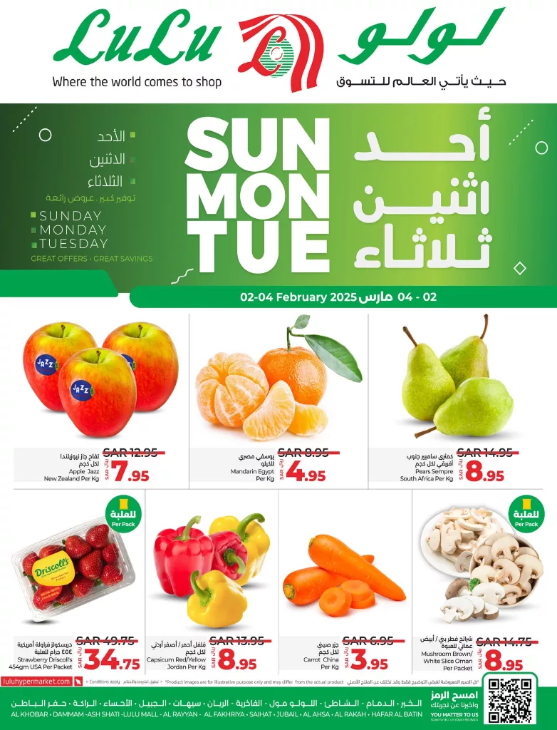 كما تتضمن عروض لولو المنطقة الشرقية تخفيضات مذهلة على الفواكه والخضروات الطازجة بما في ذلك التفاح النيوزيلندي والكمثرى الجنوب أفريقية واليوسفي المصري بالإضافة إلى الخضروات الطازجة مثل الفلفل الألوان والجزر الصيني والفطر الأبيض والبني و هذه العروض فرصة رائعة للتوفير على المنتجات الطازجة