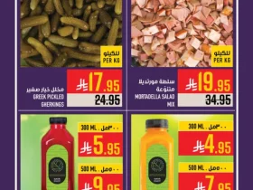 تقدّم أيضًا عروضا مميزة على اللحوم والدواجن والأسماك حيث تشمل لحوم غنم كينية طازجة ودجاج ذهبي مبرد وسمك هامور أبيض وروبيان مزرعة محلي وسمك دورادوم عماني إلى جانب تنوع واسع من الأسماك المجمدة والطازجة مثل السافي والميلك فيش والساليه الكبير