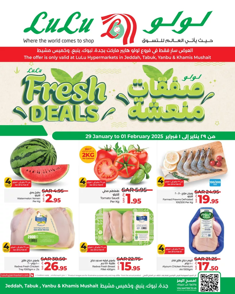 عروض لولو جدة تقدم تشكيلة رائعة من التخفيضات على اللحوم الطازجة والأسماك والخضروات مما يتيح للمتسوقين فرصة الاستمتاع بأفضل الأسعار على المنتجات الأساسية و يتوفر لحم الضأن المحلي والمكعبات البرازيلية بأسعار منافسة بالإضافة إلى دجاج طازج من علامات تجارية موثوقة مثل الوطنية وتمانيا.