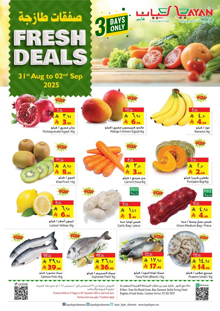 عروض ليان هايبر ماركت الأحد 31 أغسطس 2025 تقدم تشكيلة متنوعة من الفواكه الطازجة والخضروات بأسعار منافسة تشمل الرمان المصري والمانجو الكريمسون والموز الأصفر والكيوي والليمون الأصفر و تشمل أيضا خضروات مختارة بعناية مثل الجزر الصيني والقرع الكبير إلى جانب أكياس الثوم والبصل التي تعد من الأساسيات اليومية