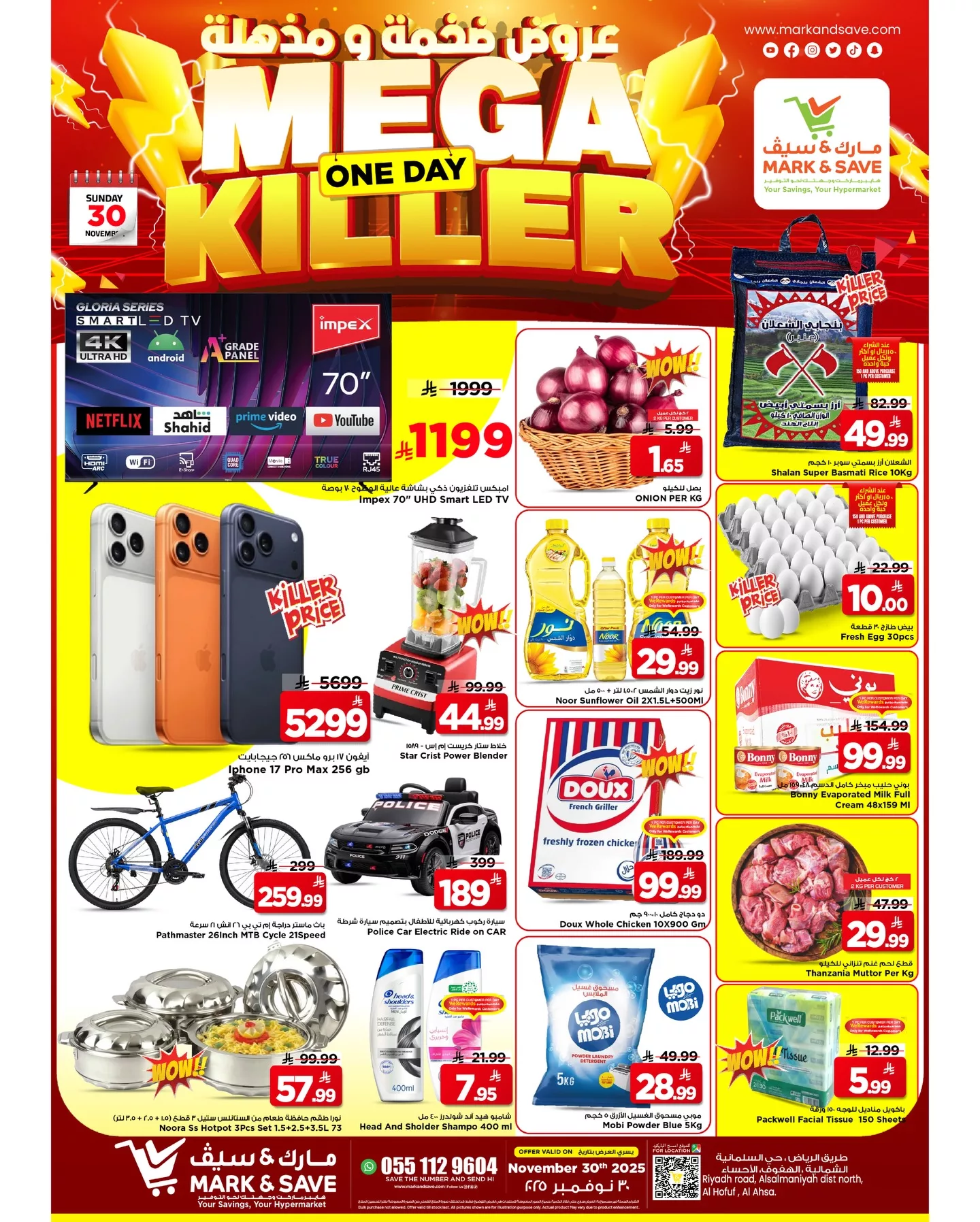 مازلنا نتابع معكم عروض مارك اند سيف الاحساء الاحد 30 نوفمبر 2025 و بتوفر الشاشات الكبيرة وحتى الهواتف الحديثة والدراجات والألعاب الكهربائية للأطفال بجانب كمان خلاطات وأطقم قدور وأدوات تقديم الطعام و غيرها من المنتجات و بارخص الاسعار المناسبة للكل فقط تابعونا علي موقعكم عروض توداي ليصلكم كل جديد .