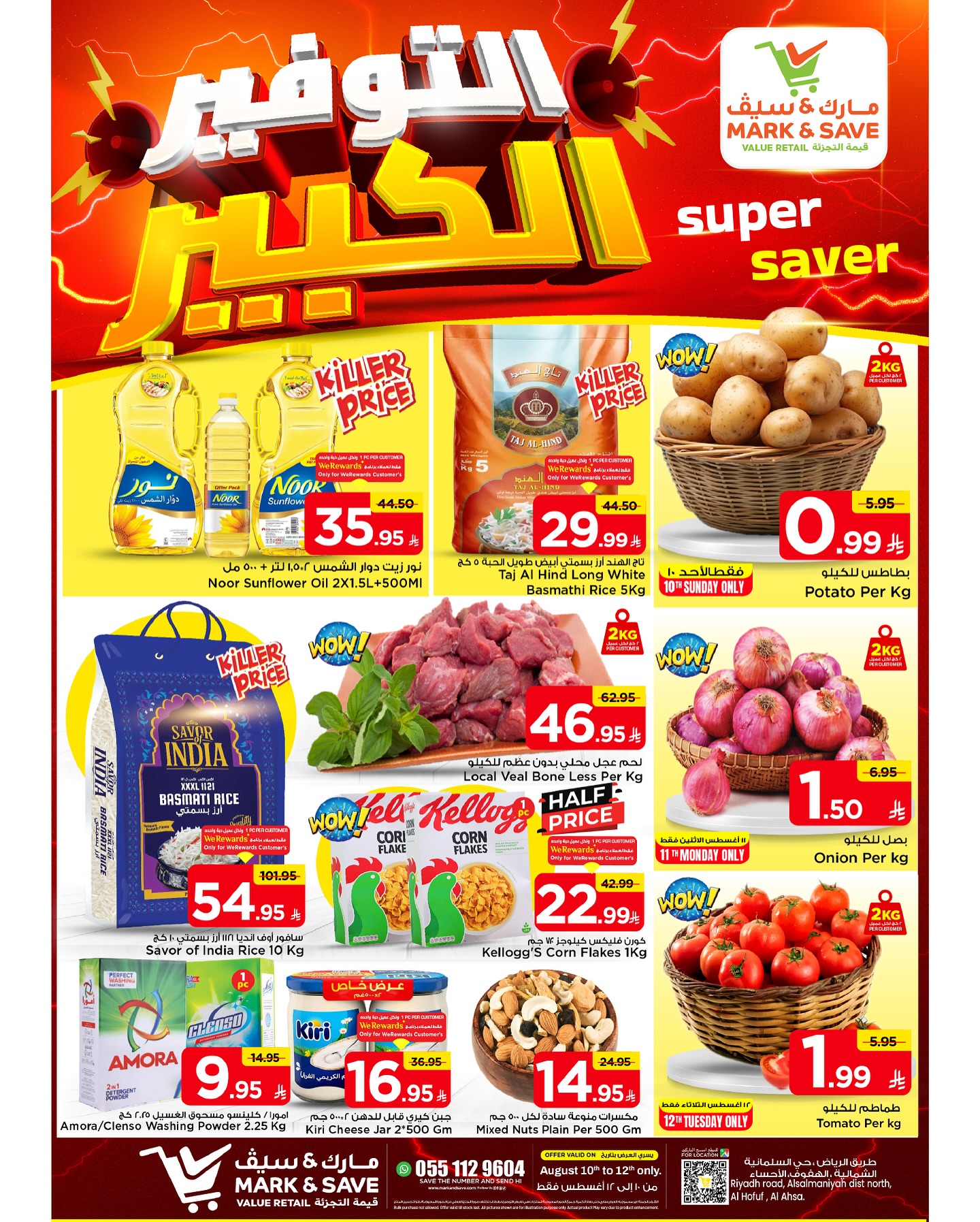 عروض مارك اند سيف الاحساء الاحد 10 اغسطس 2025 تقدم تخفيضات مميزة على البطاطس الطازجة عالية الجودة المناسبة لجميع الوصفات بالإضافة إلى اللحوم المحلية الطرية و تضم أيضا تشكيلة من المنتجات الأساسية التي لا غنى عنها في المطبخ مثل الزيوت النباتية النقية والمنظفات الفعالة كما يشمل تشكيلة من الخضار والفواكه الطازجة
