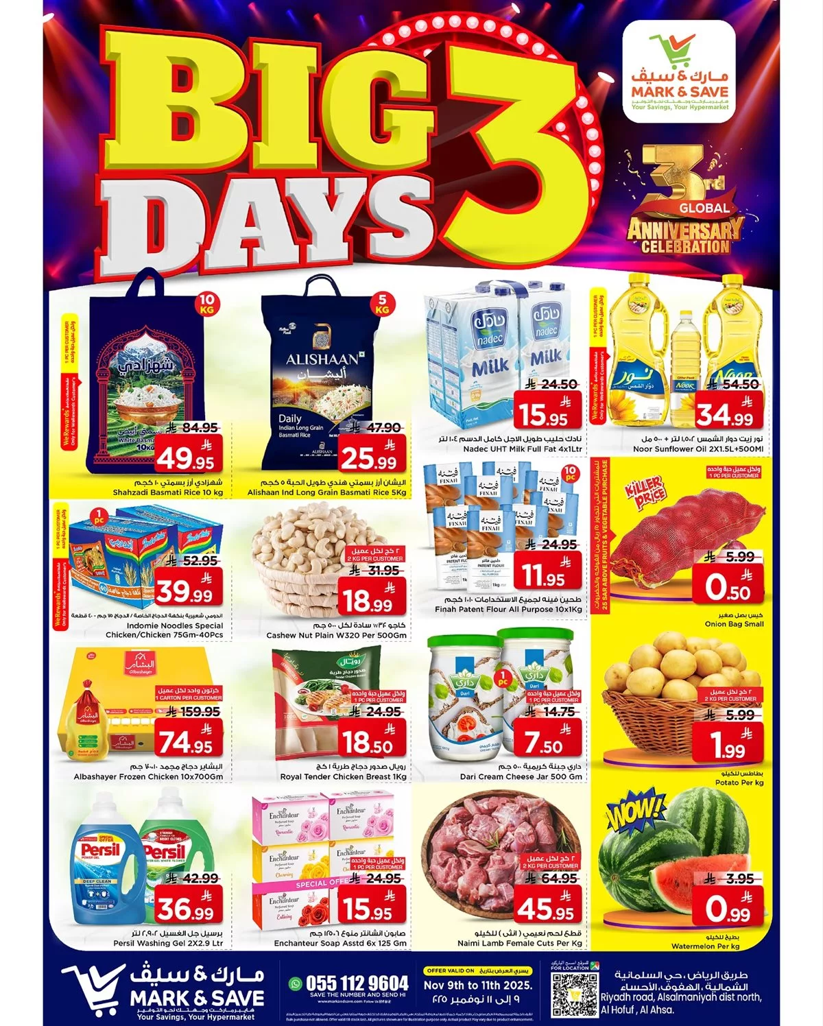 نتابع معكم احدث عروض مارك اند سيف الاحساء الاحد 9 نوفمبر 2025 وتحتوي علي مجموعة متنوعة من المنتجات الطازجة والبقوليات والمكسرات والحلويات والأجبان وتشكيلة من المعجنات والدجاج المجمد والعصائر والزبدة والآيسكريم والمنظفات وبتوفر كمان تشكيلة كبيرة من اللحوم الطازجة باقل الاسعار لمدة 3 ايام