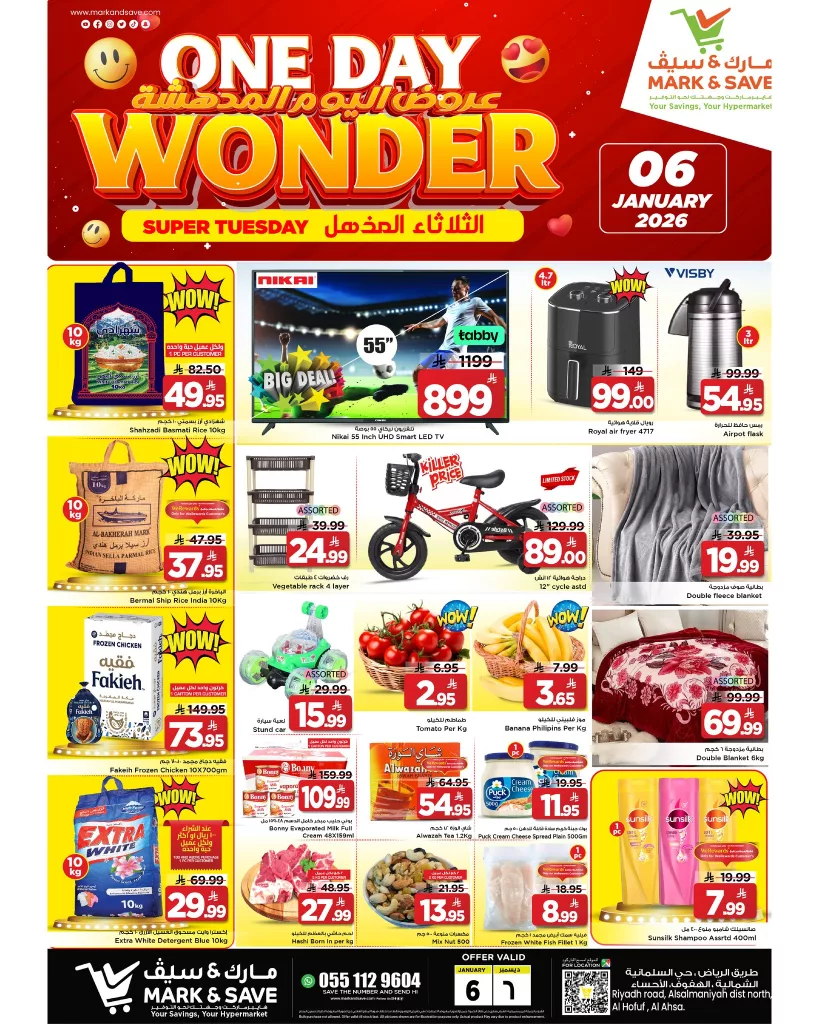 بنقدم لكم عروض مارك اند سيف الاحساء ليوم الثلاثاء 17-7-1447هـ الموافق 6 يناير 2026 و بتحتوي علي منتجات متنوعة من الكترونية كـ شاشات التلفزيون و الغلايات و منها منتجات غذائية كالارز و السكر و بتوفر كمان تشكيلة من مستلزمات المطبخ و ادوات تحضير الطعام و باسعار مناسبة للجميع