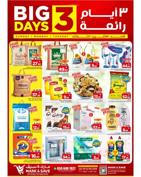 عروض مارك اند سيف الرياض الطازج الاحد 4 يناير 2026 وتحتوي علي تلفزيونات حديثة ومكانس كهربائية قوية وهواتف مع حقائب سفر عملاقة وساعات ودراجات هوائية ملونة وأواني طهي واسعة و بتوفر كمان تشكيلة من اللحوم والدواجن والأرز والزيوت ومنتجات التنظيف والسوائل والأطعمة المعلبة