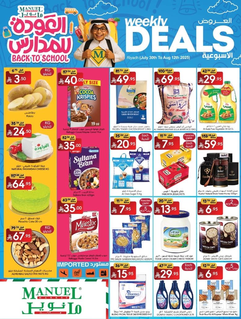 عروض مانويل الرياض الأسبوعية بمناسبة العودة للمدارس الأربعاء 6-8-2025 تشمل مجموعة من المنتجات الغذائية المميزة مثل المعلبات الجاهزة من الخضروات والفاصوليا والصلصات الإيطالية بالإضافة إلى العصائر الطبيعية إلى جانب أجهزة منزلية عملية مثل مكائن تحضير القهوة والمراوح المحمولة والخلاطات الكهربائية والغلايات