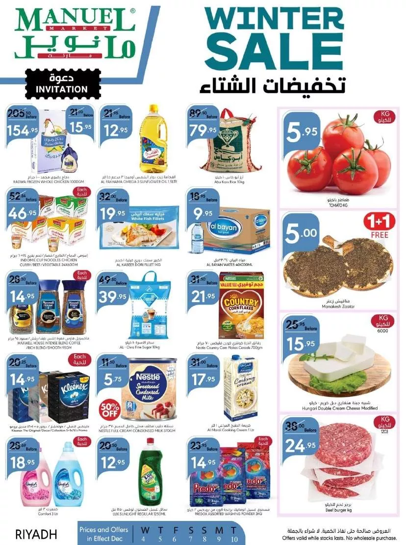 عروض مانويل الرياض يوم الأربعاء 4 ديسمبر 2024 تقدم تخفيضات استثنائية على المنتجات الغذائية الطازجة والسلع الأساسية و تشمل العروض اللحوم الطازجة والدواجن المجهزة بالإضافة إلى الأسماك الطازجة والمأكولات البحرية عالية الجودة مثل الروبيان والكاليماري كما تضم العروض أسعارا مخفضة على منتجات الإفطار