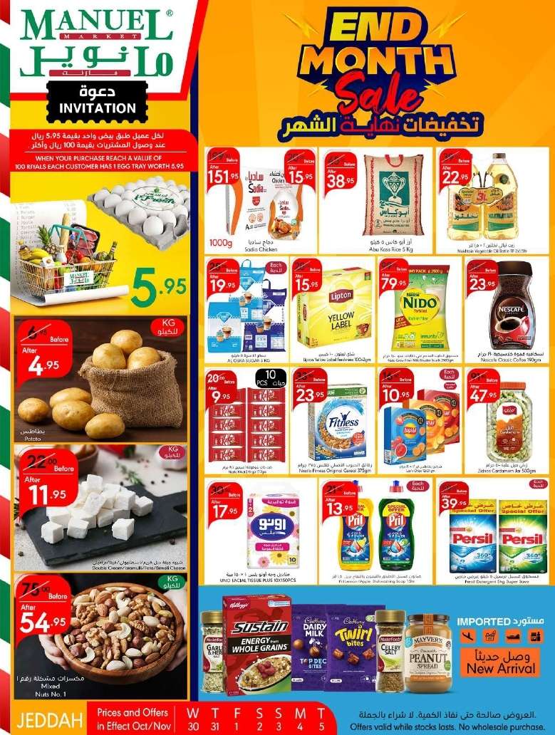 عروض مانويل جدة يوم الأربعاء 30 أكتوبر 2024 تتضمن خصومات جذابة على المنتجات الطازجة بما في ذلك الخضروات والفواكه الموسمية واللحوم الطازجة مما يجعلها خياراً مثالياً لسكان جدة الراغبين في الحصول على منتجات عالية الجودة بأسعار منخفضة كما تشمل العروض السلع الأساسية مثل الأرز والزيوت،