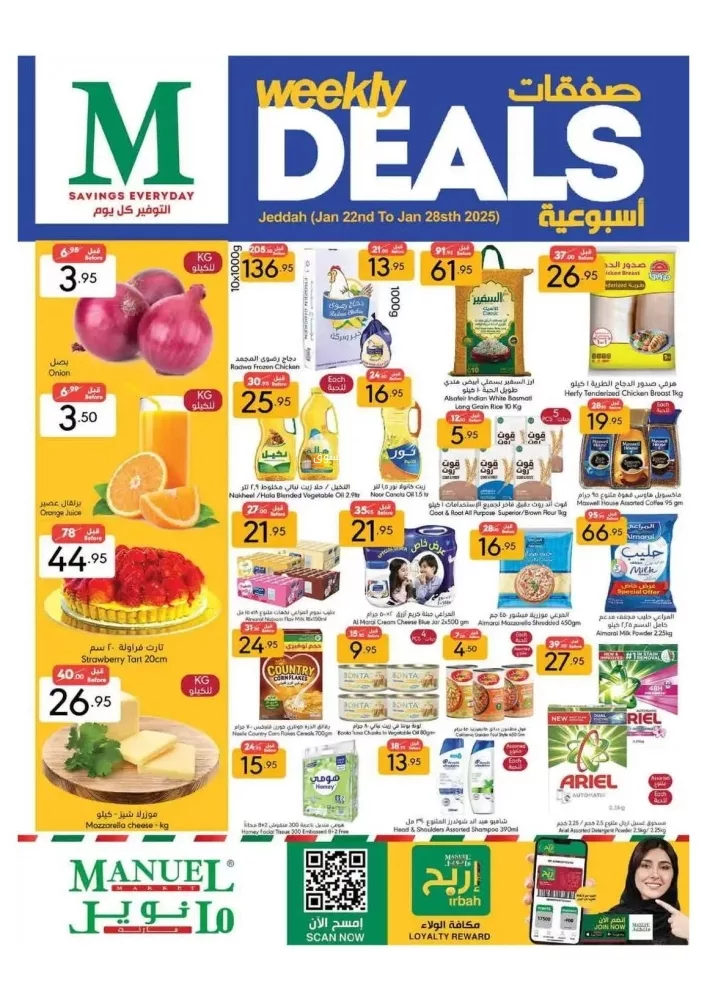 كما تشمل عروض مانويل جدة تخفيضات هائلة على المأكولات البحرية الطازجة والمواد الغذائية الأساسية التي يحتاجها كل منزل و يمكن للعملاء الاستمتاع بخصومات رائعة على المنتجات الاستهلاكية بما في ذلك المنظفات والزيوت والحبوب والأجبان و هذا بالإضافة إلى العروض على المنتجات المجمدة والمعلبات،