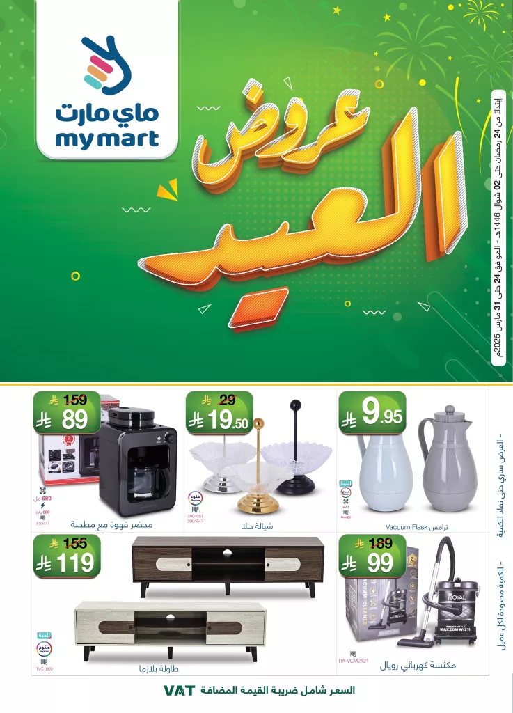 عرض ماي مارت الاثنين 24 مارس 2025 لا يقتصر على الأجهزة فقط بل يمتد إلى احتياجات الأسرة اليومية من أدوات منزلية وأثاث بسيط إلى منتجات التنظيف والمناديل ومنتجات البلاستيك المتنوعة لتلبية مختلف احتياجات العائلة في شهر رمضان وعيد الفطر بتخفيضات تناسب الجميع