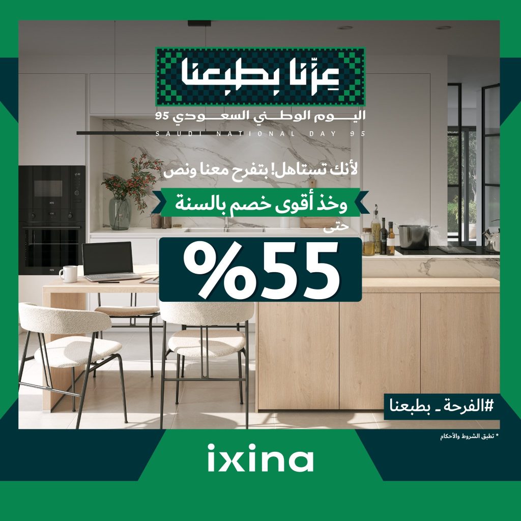 عرض مطابخ اكسينا IXINA Kitchens الذي يقدم خصومات استثنائية تصل حتى 55٪ على المطابخ هذه الفرصة الذهبية تمنح العملاء إمكانية الحصول على مطابخ عصرية بأفضل الأسعار مع الجودة الأوروبية التي اشتهرت بها اكسينا في تصميم المطابخ لا تفوتوا فرصه التخفيضات في اليوم الوطني السعودي 2025