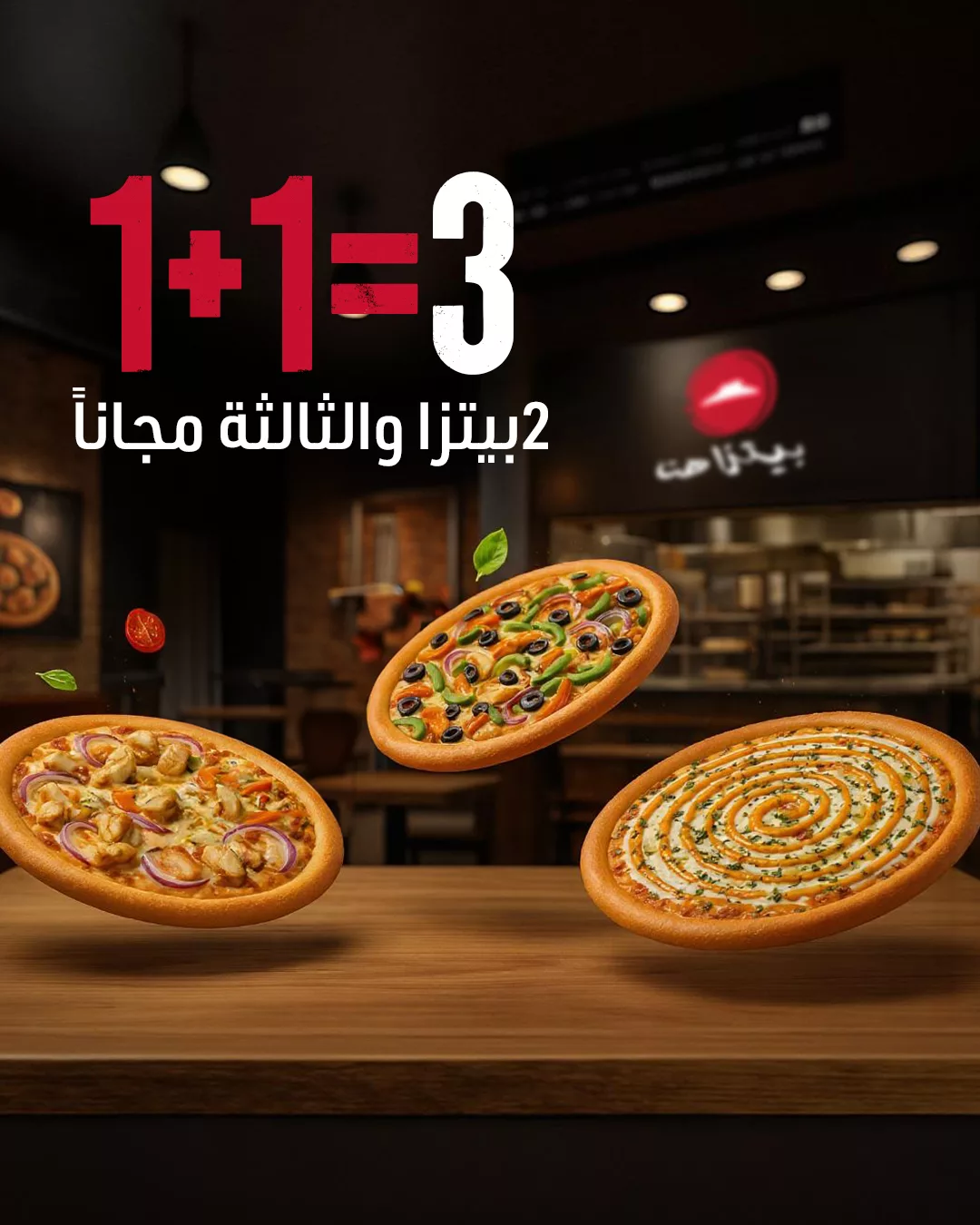 يقدم لكم مطعم بيتزا هت عرض مميز لمحبي البيتزا اطلب 2 بيتزا و احصل على الثالثه مجانا اليوم 18 اكتوبر 2025