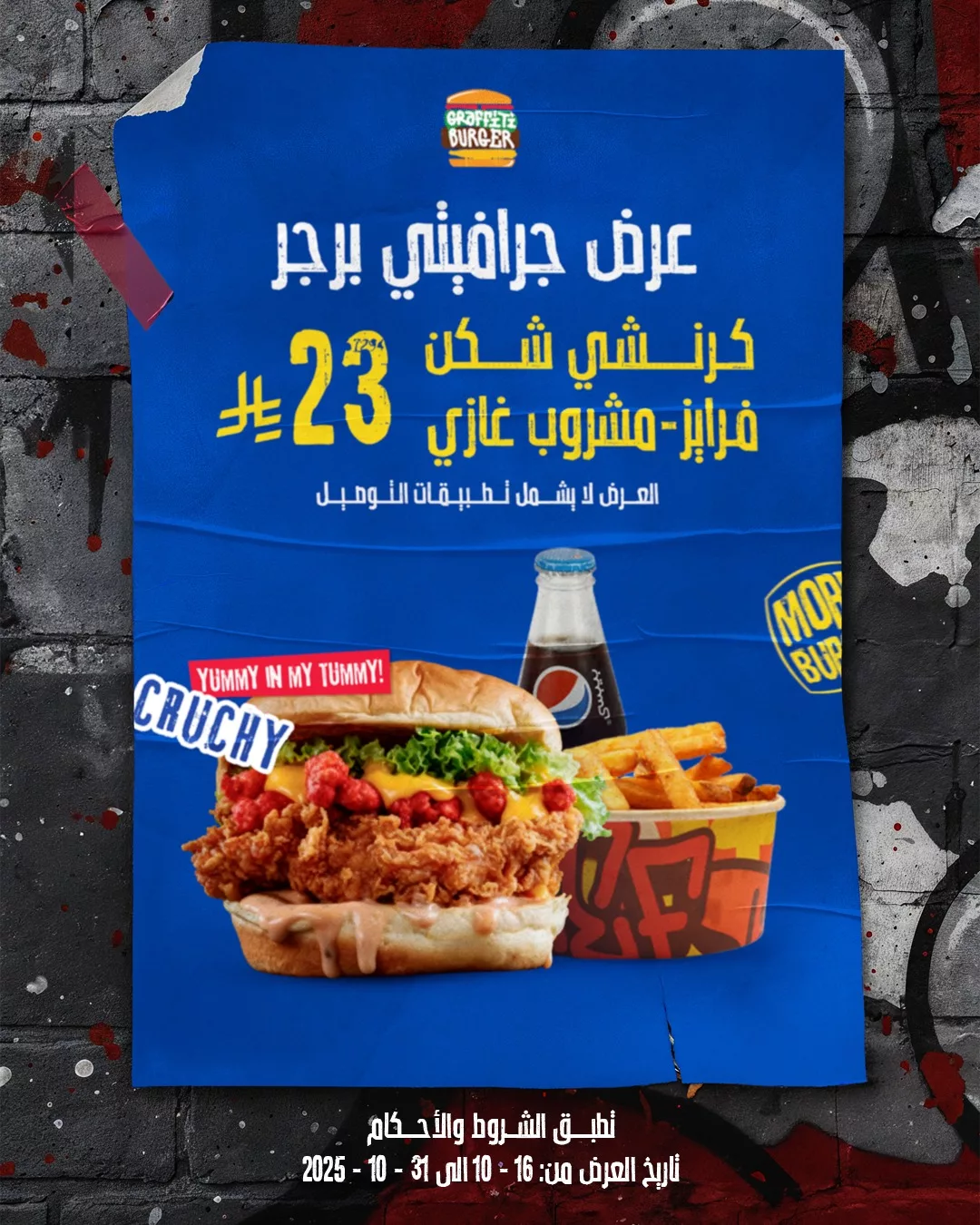 عروض مطعم جرافيتي برجر على كرنشي تشكن و بريوش حتى 31 اكتوبر 2025 اشهى الوجبات بأسعار منافسة هذه العروض مستمرة لنهاية الشهر لا تفوتوها.