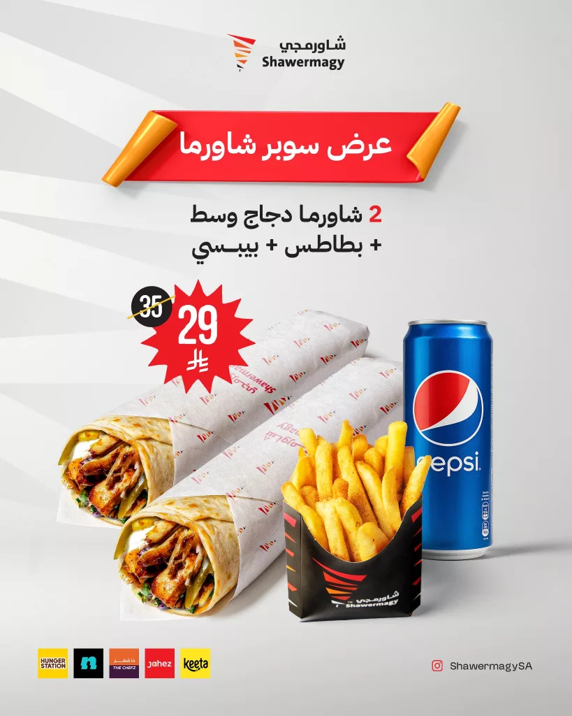 عرض سوبر شاورما من شاورمجي يشمل أيضا بطاطس مقرمشة بإتقان ومشروب بيبسي بارد يكمل متعة الوجبة لمحبّي الطعم المتوازن والتجربة السريعة هذا العرض مصمم خصيصًا لتوفير وجبة متكاملة تناسب الأفراد الباحثين عن نكهة غنية وسرعة في التقديم احصل على وجبتك من أقرب فرع أو عبر تطبيقات التوصيل المعتمدة