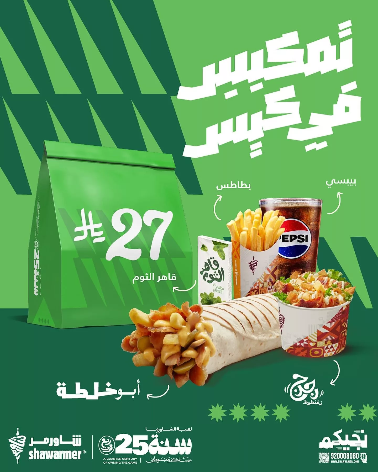 عروض مطعم شاورمر تقدم الشاورما التقليدية و تتضمن وجبة تمكيس في كيس شاورما ملفوفة غنية بالبطاطس والصوص داخلها وتضاف إليها البطاطس المقرمشة وصوص الثوم المميز مع مشروب غازي وطبق بطاطس باقل الاسعار تابعونا لمعرفة كل جديد عن عروض المطاعم علي موقعكم عروض توداي .