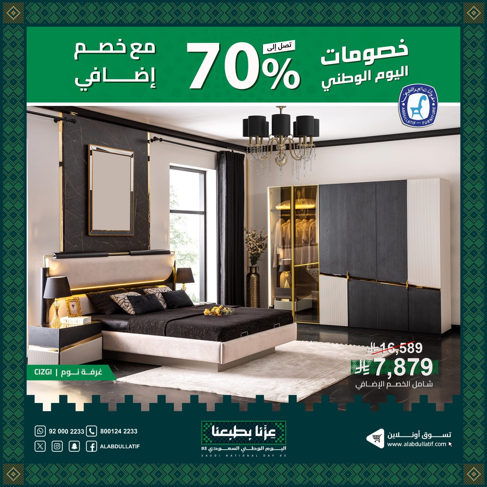 تقدم مفروشات العبداللطيف أقوى التخفيضات على الأثاث المنزلي والمكتبي والسجاد والموكيت بأحدث التصاميم وبأفضل الأسعار. بمناسبة اليوم الوطني السعودي 95 فيها خصومات تصل حتى 70% مع خصم إضافي لذلك لا تفوتوا هذه العروض الحصرية من مفروشات العبداللطيف
