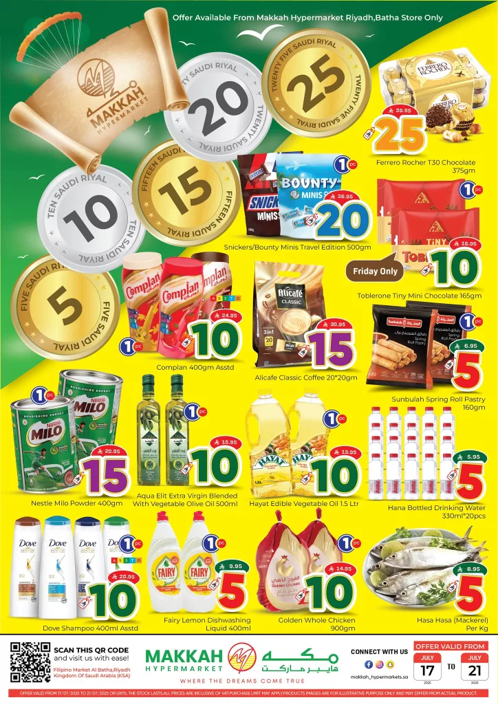 عروض مميزة من مكة هايبر ماركت الخميس 17-7-2025 على تشكيلة واسعة من المنتجات الغذائية تشمل الشوكولاتة الفاخرة مثل فيريرو روشيه وسنيكرز وباونتي بالإضافة إلى مشروبات مثل كومبلان وميلو وقهوة ألي كافيه كما تشمل التخفيضات منتجات الطهي مثل زيت الزيتون وزيت الذرة ومياه الشرب