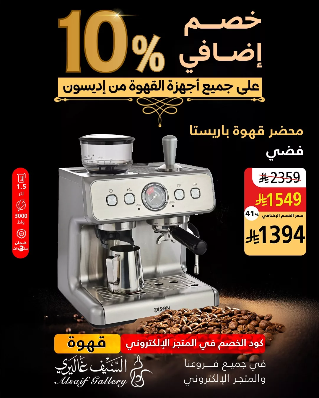 تُعد أجهزة القهوة من إديسون من الخيارات الرائجة لعشاق القهوة في السعودية، حيث تتميز بتصاميمها العصرية وأدائها القوي الذي ينافس العلامات الكبرى، واليوم تقدم السيف غاليري عرضاً مميزاً يشمل خصماً إضافياً بنسبة 10٪ على جميع أجهزة القهوة من إديسون، ضمن عروض الصيف المتجددة. العرض ساري في جميع فروع السيف غاليري وعبر المتجر الإلكتروني باستخدام كود الخصم قهوة