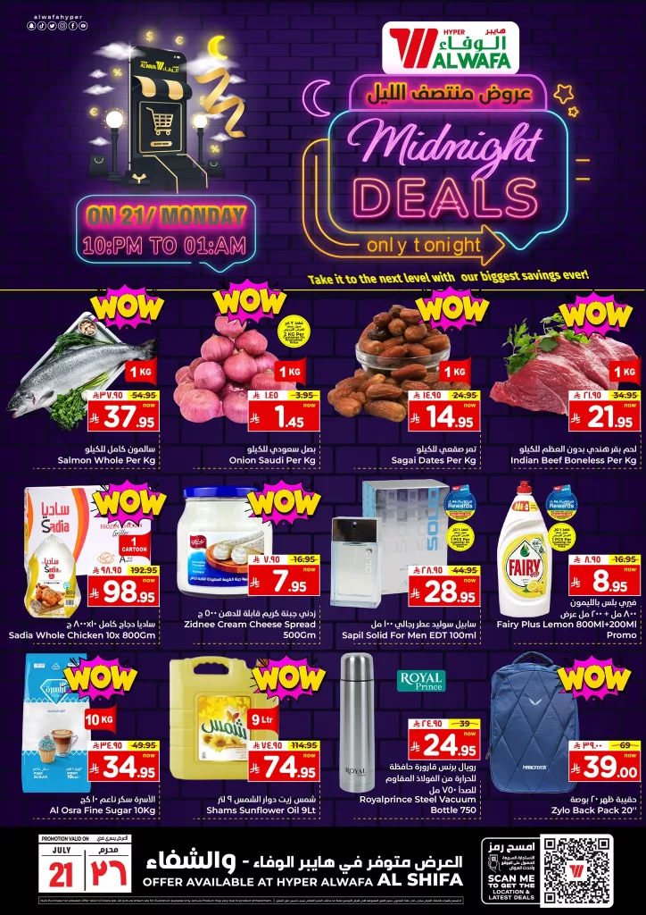 عروض الوفاء هايبر ماركت الاثنين 21 يوليو 2025 تقدم تجربة تسوق استثنائية تمتد من الساعة العاشرة مساءً وحتى الواحدة صباحًا وتضم تشكيلة واسعة من المنتجات الطازجة مثل اللحوم والأسماك والخضروات بالإضافة إلى التمور المختارة بعناية