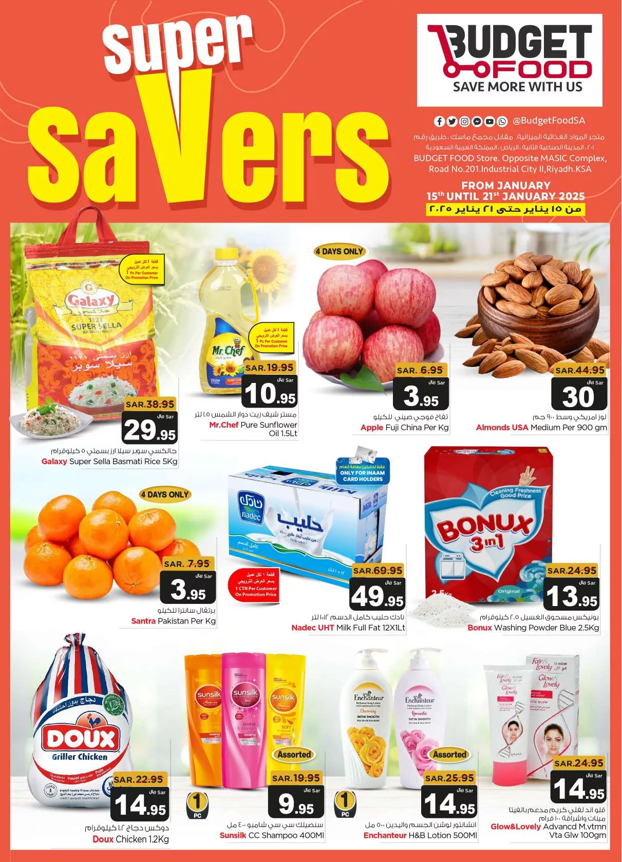 عروض ميزانية الطعام الأربعاء 15 يناير 2025 تقدم خصومات مميزة على مجموعة متنوعة من المنتجات التي تلبي احتياجات الأسرة بأسعار اقتصادية و تشمل العروض تخفيضات على منتجات البقالة الأساسية والزيوت النباتية بالإضافة إلى البقوليات والمعكرونة التي تعد مكونات أساسية للوجبات اليومية.