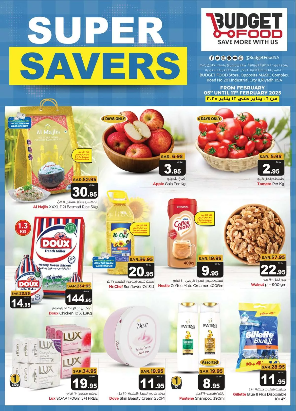 عروض ميزانية الطعام الخميس 6 فبراير 2025 توفر خصومات هائلة على السلع الغذائية الأساسية مثل السكر و الطحين و الزيوت النباتية والمعكرونة مما يجعل التسوق أكثر توفيرا كما تتوفر عروض على المشروبات الساخنة مثل القهوة العربية و الشاي الأخضر والكاكاو بالإضافة إلى تخفيضات على الشوكولاتة الفاخرة،