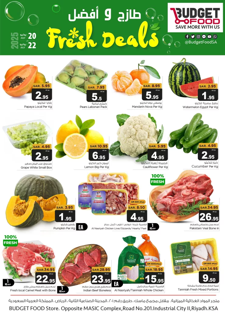 عروض ميزانية الطعام الأحد 20 يوليو 2025 تقدم تشكيلة طازجة من الفواكه والخضروات التي تلبي احتياجات الأسرة اليومية من المنتجات الطازجة بنكهاتها الطبيعية حيث تتوفر البابايا والكمثرى واليوسفي والبطيخ والعنب والليمون والقرنبيط والخيار والقرع بأسعار مغرية