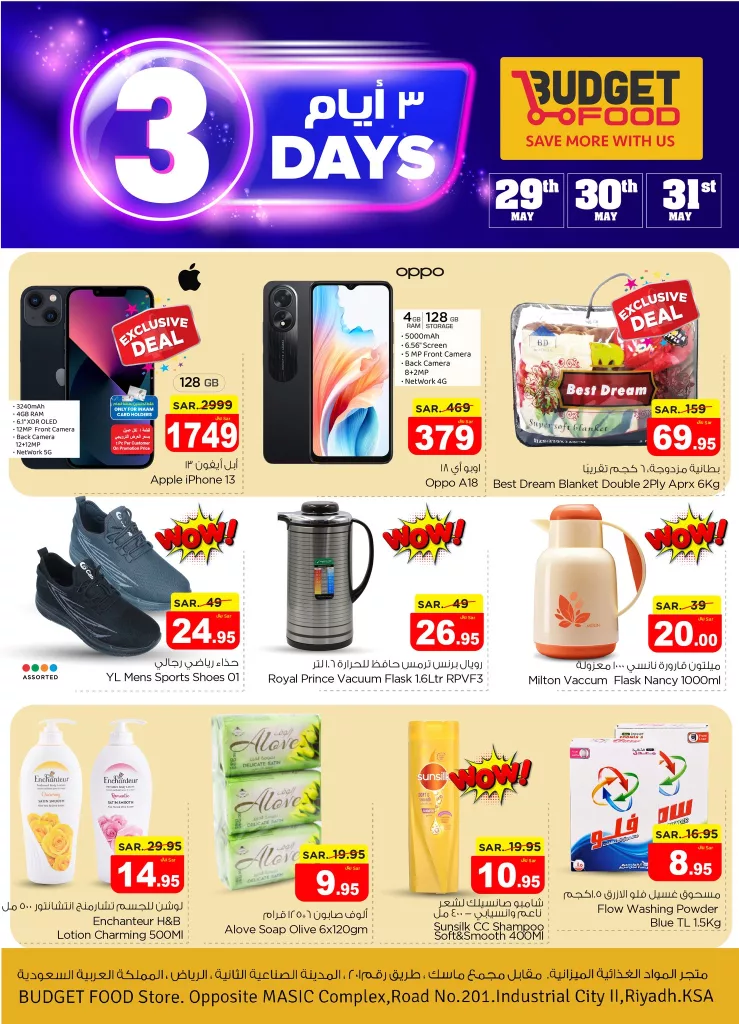 عروض ميزانية الطعام تقدم أيضا تشكيلة مميزة من المكسرات مثل الجوز والكاجو بالإضافة إلى عروض قوية على الإلكترونيات مثل آيفون وأجهزة أوبو والبطانيات الفاخرة كما تشمل التخفيضات منتجات منزلية مثل الترامس والأحذية الرجالية ومنتجات العناية الشخصية مثل الشامبو والصابون واللوشن ومساحيق الغسيل