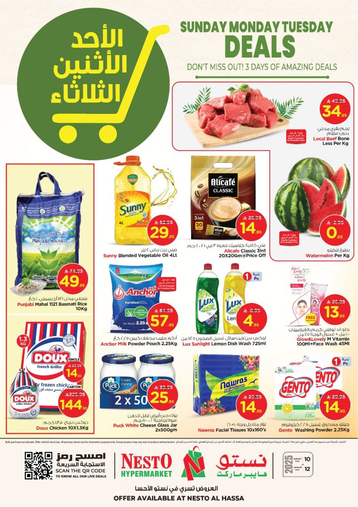 عروض نستو الأحساء الأحد 10 اغسطس 2025 تقدم تشكيلة واسعة من المنتجات الغذائية الطازجة والمعبأة حيث تشمل اللحوم الطازجة والفواكه الموسمية بالإضافة إلى الأرز البسمتي وزيت الطهي والقهوة المميزة ومنتجات الألبان الشهيرة كما تتوفر منتجات تنظيف الصحون والمنظفات المنزلية مع عروض على مستحضرات العناية بالبشرة والوجه