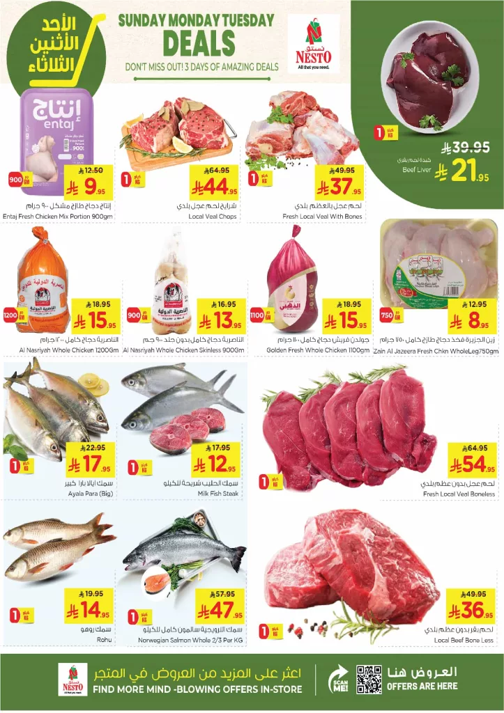 عروض نستو الأحساء الطازج تشمل كذلك لحوم طازجة ومنتجات مجمدة وأسماك مختارة بعناية حيث تتوفر خيارات من لحم العجل المحلي بالعظم وبدون عظم والدجاج الكامل والمجزأ بأنواعه المختلفة إلى جانب الأسماك المتنوعة مثل السلمون والروهو والحليب وتضم العروض أيضًا منتجات الحليب والشاي والقهوة والمنظفات الشخصية