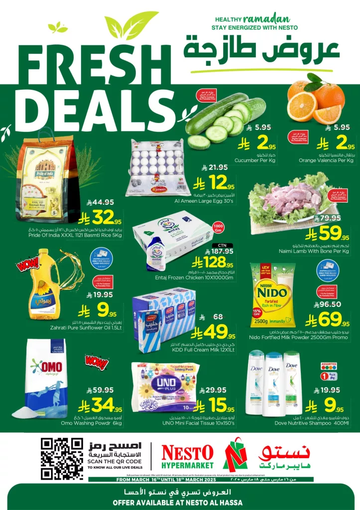 لمحبي الفواكه والخضروات الطازجة و يوفر نستو الأحساء مجموعة متنوعة من المنتجات الطازجة بأسعار مخفضة مما يتيح لك شراء الخيار و البرتقال وغيرها من المنتجات الطازجة بأسعار مناسبة كما تتوفر عروض على المنظفات ومنتجات العناية الشخصية مما يجعل التسوق في نستو فرصة مثالية لتوفير المال مع الحفاظ على الجودة العالية.