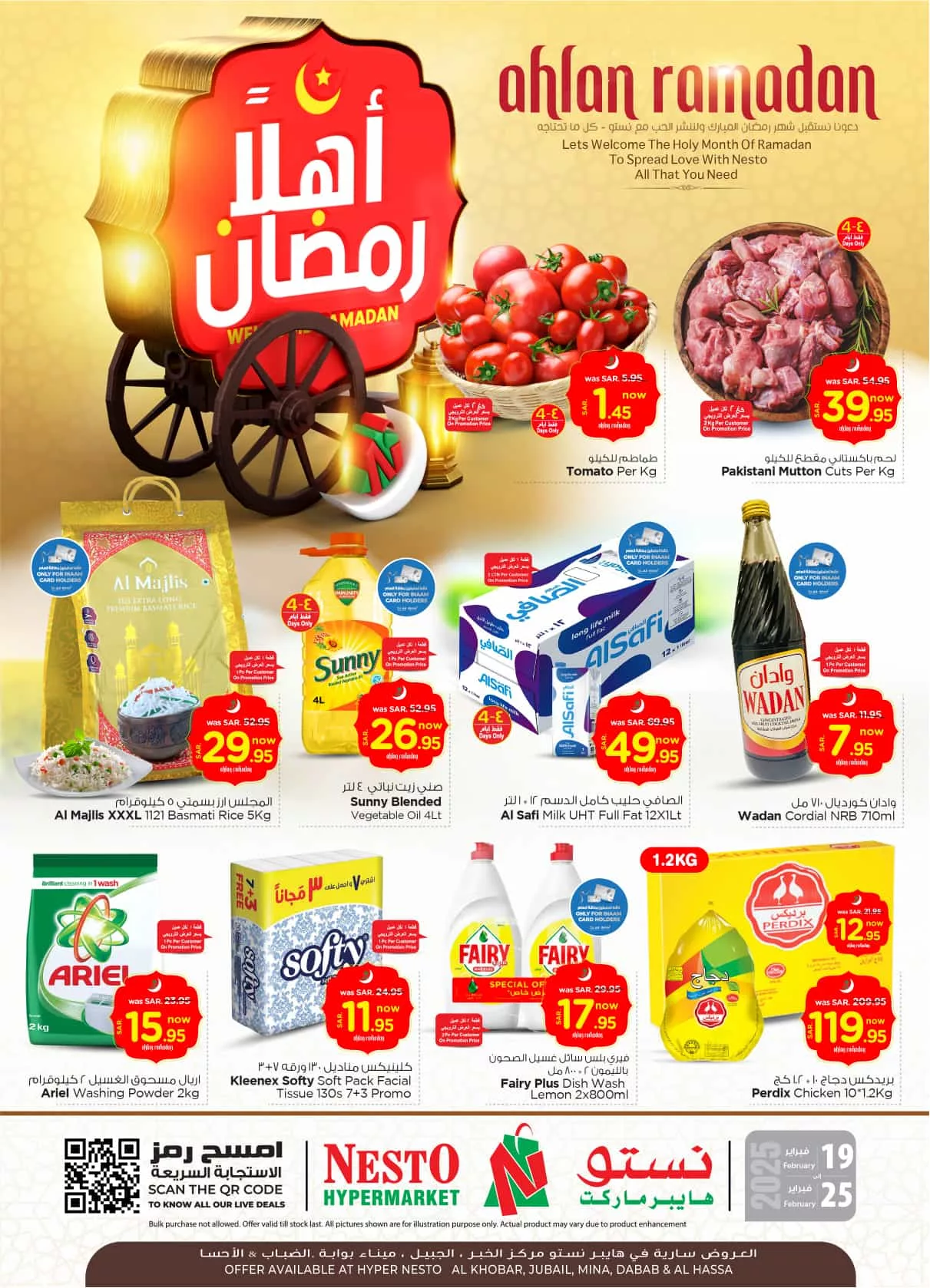 عروض نستو الدمام الأربعاء 19 فبراير 2025 تقدم خصومات على السلع الغذائية حيث تتوفر العروض على الأرز البسمتي وزيوت الطهي و تخفيضات على اللحوم الطازجة و الدواجن المجمدة والمأكولات البحرية بأسعار تنافسية مع عروض مميزة على الفواكه والخضروات الطازجة بمناسبة شهر رمضان الكريم .