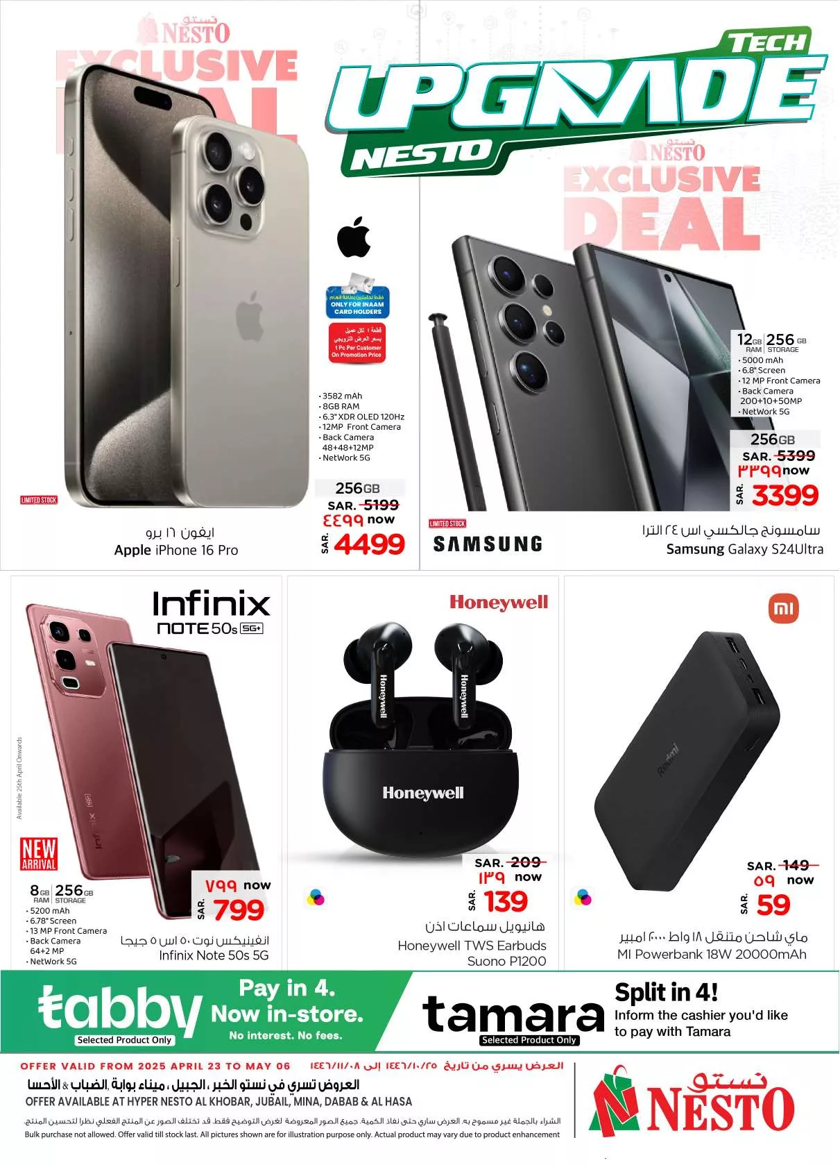 عروض نستو الدمام الخميس 24 أبريل 2025 تقدم تشكيلة متنوعة من الإلكترونيات الذكية مثل التابلتات الحديثة والهواتف الذكية من ماركات شهيرة مثل أوبو وسامسونج وتكنو بتقنيات الجيل الخامس وسعات تخزين مرتفعة لتناسب جميع الاستخدامات كما تشمل السماعات المحمولة وأجهزة الشحن السريع