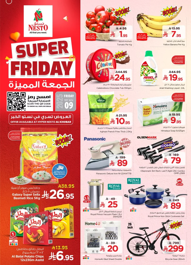 عروض نوري هايبر ماركت تشمل أيضًا مجموعة مختارة من السلع الغذائية مثل البطاطس المقلية الفرنسية والأرز البسمتي الفاخر من جلاكسي مع مجموعة خفيفة من شرائح بطاطس البطال بنكهات متنوعة كما تبرز أدوات المنزل مثل المكواة والترامس وأطقم الطهي الفاخرة والدراجات ضمن باقة واحدة تتيح للمتسوقين
