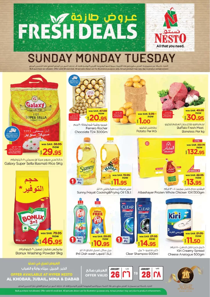 عروض نستو الدمام الأحد 26 يناير 2025 تقدم تخفيضات مميزة على مجموعة واسعة من المنتجات الطازجة بما في ذلك الخضروات والفواكه الطازجة بأفضل الأسعار و يمكنك الحصول على تفاح رويال جالا وبرتقال فالنسيا بأسعار مخفضة بالإضافة إلى الليمون الفيتنامي والبطيخ الطازج