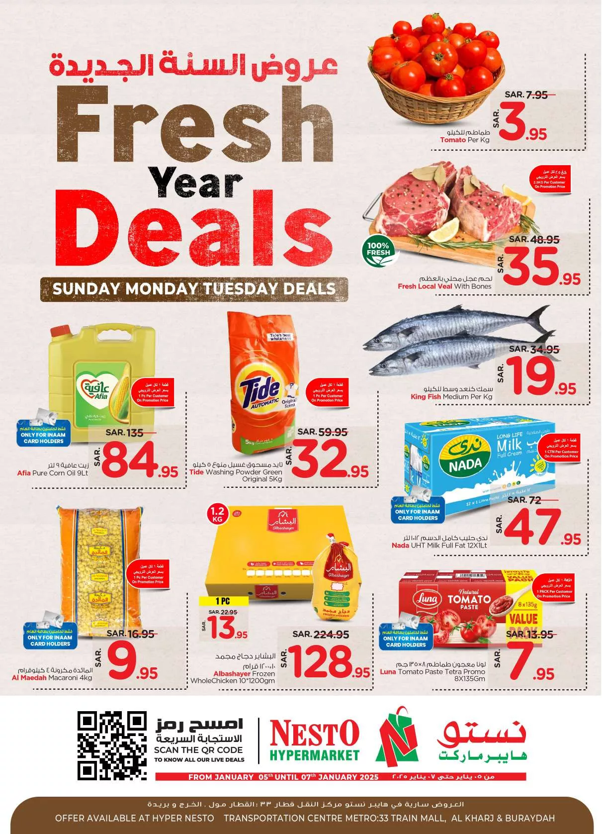 عروض نستو الرياض الأحد 5 يناير 2025 تتميز بتوفير مجموعة كبيرة من المنتجات الغذائية والخضروات الطازجة بأسعار تنافسية و تشمل العروض خيارات متنوعة من الفواكه مثل التفاح والليمون والعنب بجانب الخضروات الطازجة مثل الجزر والفاصوليا الخضراء لتلبية جميع احتياجات العائلات بأسعار مخفضة.
