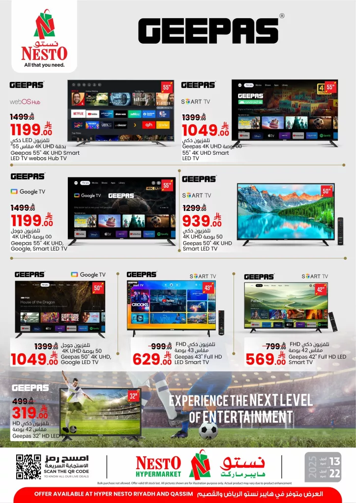 عروض نستو الرياض ليوم الأحد 13 أبريل 2025 تعتبر من أقوى العروض الحالية في عالم الإلكترونيات والمرئيات إذ تقدم سلسلة نستو هايبرماركت تخفيضات مذهلة على مجموعة شاشات Geepas الذكية والمتنوعة التي تلبي احتياجات جميع أفراد الأسرة سواء كنت تبحث عن شاشة كبيرة للسينما المنزلية أو حجم أصغر للاستخدام اليومي
