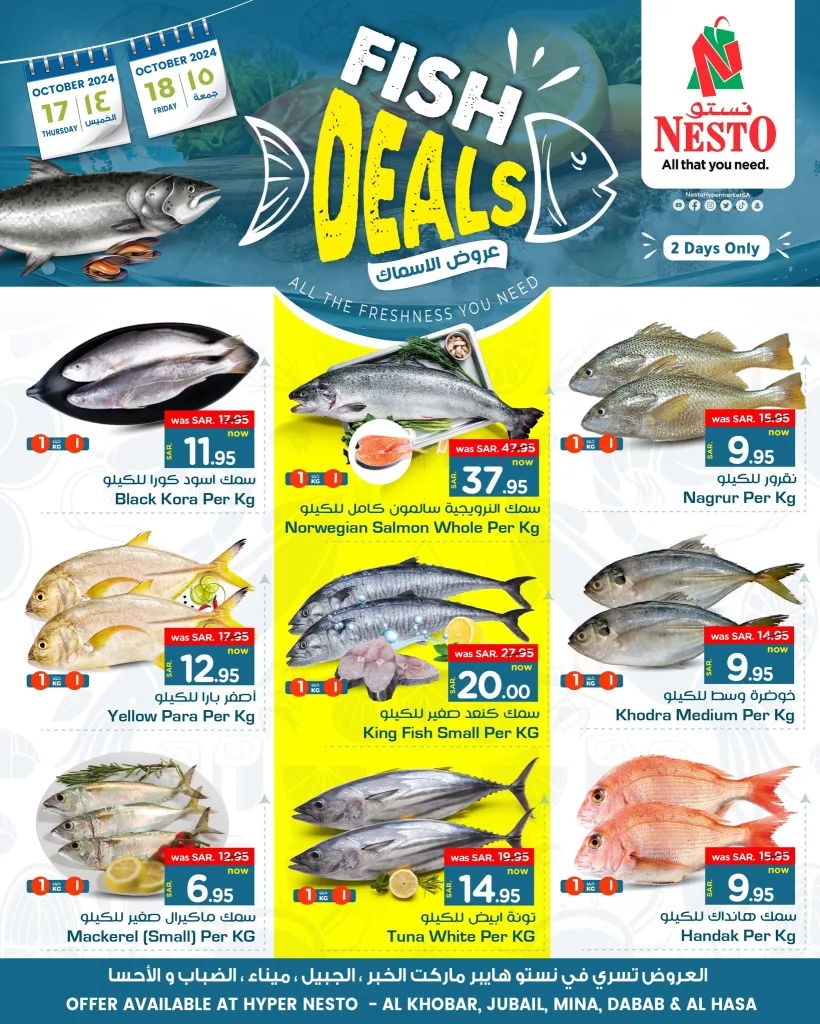تقدم نستو عروضا الاربعاء 16 اكتوبر 2024 مميزة على مجموعة من المنتجات الغذائية، بما في ذلك مجموعة واسعة من الأسماك الطازجة حيث تتنوع الخيارات بين أسماك كورا السوداء والسلمون النرويجي الكامل وأصناف أخرى مميزة بأسعار مخفضة و تقدم هذه العروض خصومات كبيرة على الأسماك بمختلف أنواعها،