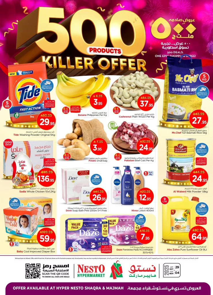 عروض نستو القصيم الأسبوعية الأربعاء 7 جمادى الأولى 1447هـ تحتوي على الأغذية الطازجة مثل الخضروات واللحوم المحلية والمنتجات البحرية والفواكه المجففة والعصائر الطبيعية والمخبوزات كما تتضمن خصومات على الأجهزة المنزلية مثل أجهزة الخبز الأوتوماتيكية وأفران التحميص ومضارب البيض الكهربائية وأجهزة صنع القهوة
