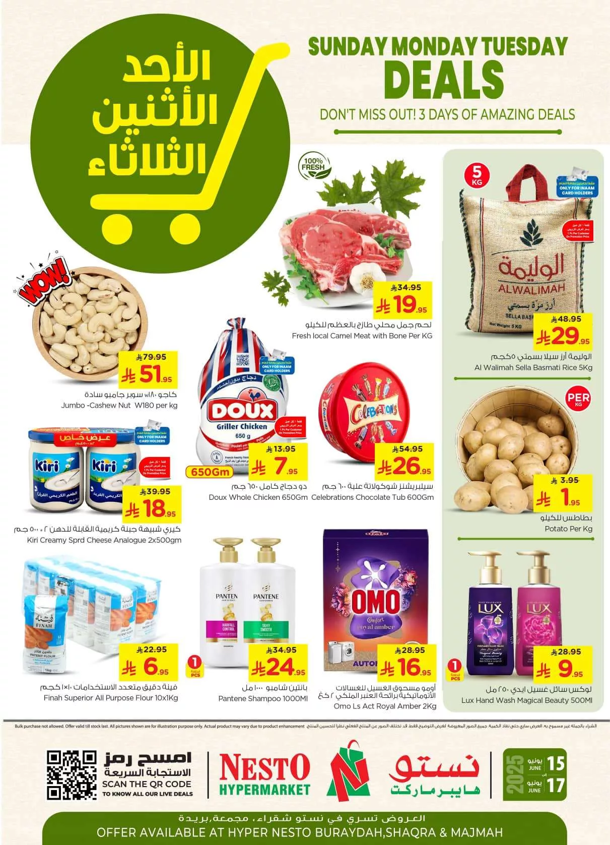 عروض نستو القصيم الأحد 15 يونيو 2025 تقدم باقة متنوعة من المنتجات اليومية التي تلبي احتياجات الأسرة السعودية بجودة عالية واختيارات مدروسة بعناية وتشمل التخفيضات اللحوم الطازجة مثل اللحم الجمل والدجاج الكامل إلى جانب الأرز البسمتي والخضروات الأساسية مثل البطاطس بالإضافة إلى منتجات الألبان