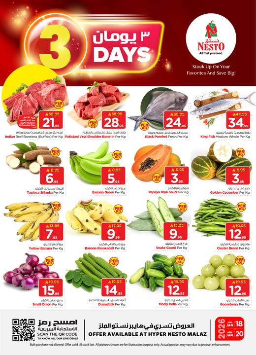 عروض نستو الملز الاحد 18-1-2026 الموافق 29 رجب 1447هـ و تحتوي علي لحم بقري إنديان ستيك وسمك ملكة الهندي وموز ومانجو وتين وخيار وفاصوليا خضراء وبصل وملوخية و بتوفر كمان الخضروات مثل البامية والباذنجان والفلفل والطماطم والفواكه كالمانجو والتين وغيرها من المنتجات في صفقات حصرية متاحة لمدة 3 ايام
