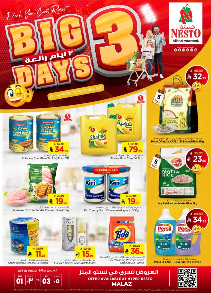 عروض نستو الملز الخميس 1 مايو 2025 تقدم تخفيضات مميزة على مجموعة مختارة من المواد الغذائية تشمل السمن والزيوت والأرز بأنواعه والدواجن المجمدة ومنتجات الأجبان حيث يمكنك الاستفادة من المنتجات الأساسية بجودة عالية وتنوع يناسب احتياجات الأسرة اليومية كما تشمل العروض أيضاً مستحضرات العناية الشخصية
