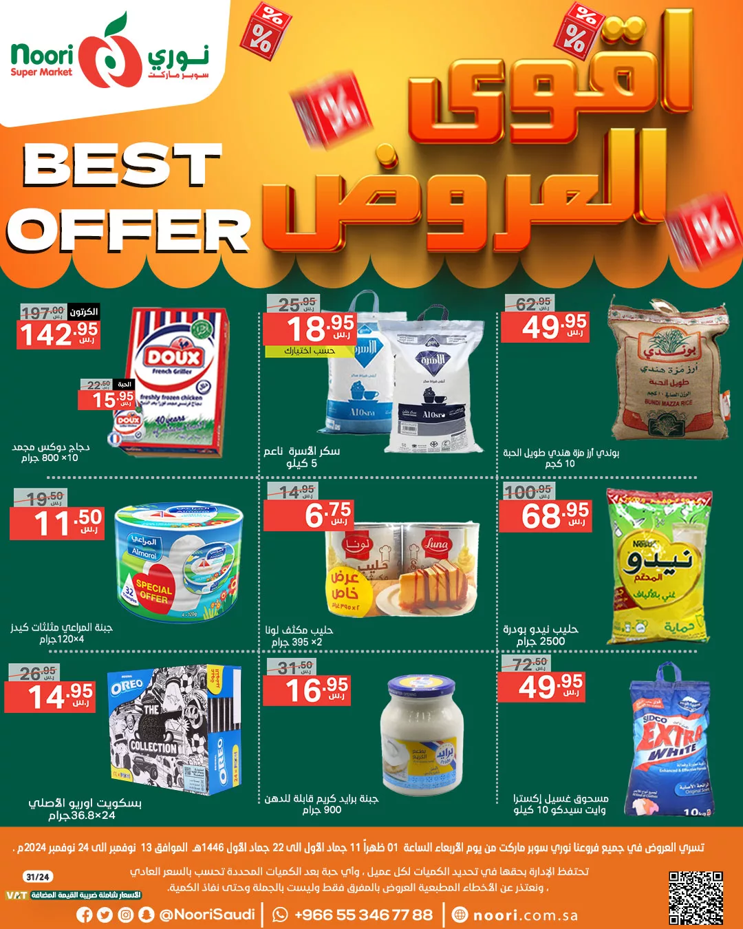 عروض نوري هايبر ماركت الأسبوعية تبدأ من الخميس 14 نوفمبر 2024، وتقدّم تخفيضات مذهلة على تشكيلة واسعة من المنتجات الطازجة مما يتيح لك تحضير وجبات متنوعة بميزانية موفرة. هناك أيضا عروض خاصة على الخضروات والفواكه الطازجة بالإضافة إلى الحبوب والأطعمة المجمدة